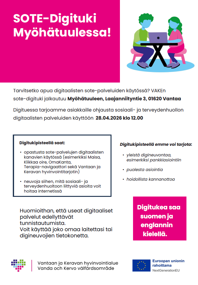 Tervetuloa tiistaina 28.4. klo 12-14 tutustumaan ja harjoittelemaan digitaalisten palveluiden kuten Maisan, Klikkaa oire ja Omakannan käyttöä VAKEn SOTE-digituen avulla .