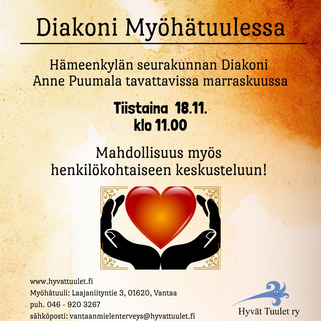 Hämeenkylän seurakunnan Diakoni Anne Puumala tavattavissa Myöhätuulessa tiistaina 18.11. klo 11.00. Mahdollisuus myös henkilökohtaiseen keskusteluun.
