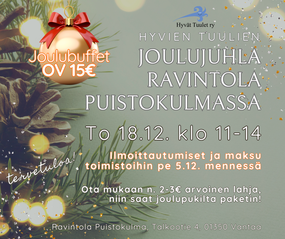 Torstaina 18.12. klo 11-14 vietetään perinteistä Hyvät Tuulet ry:n Joulujuhlaa Ravintola Puistokulmassa (Talkootie 4, 01350), ilmoittaudu sinäkin mukaan!