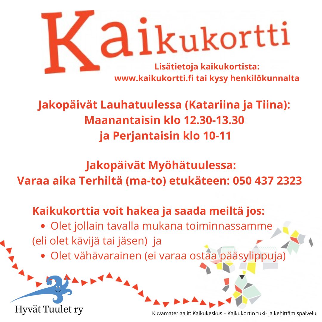 Kaikukortin voit saada meiltä jos olet jollain tavalla mukana toiminnassamme (eli olet kävijä tai jäsen) sekä olet vähävarainen (ei varaa ostaa pääsylippuja).