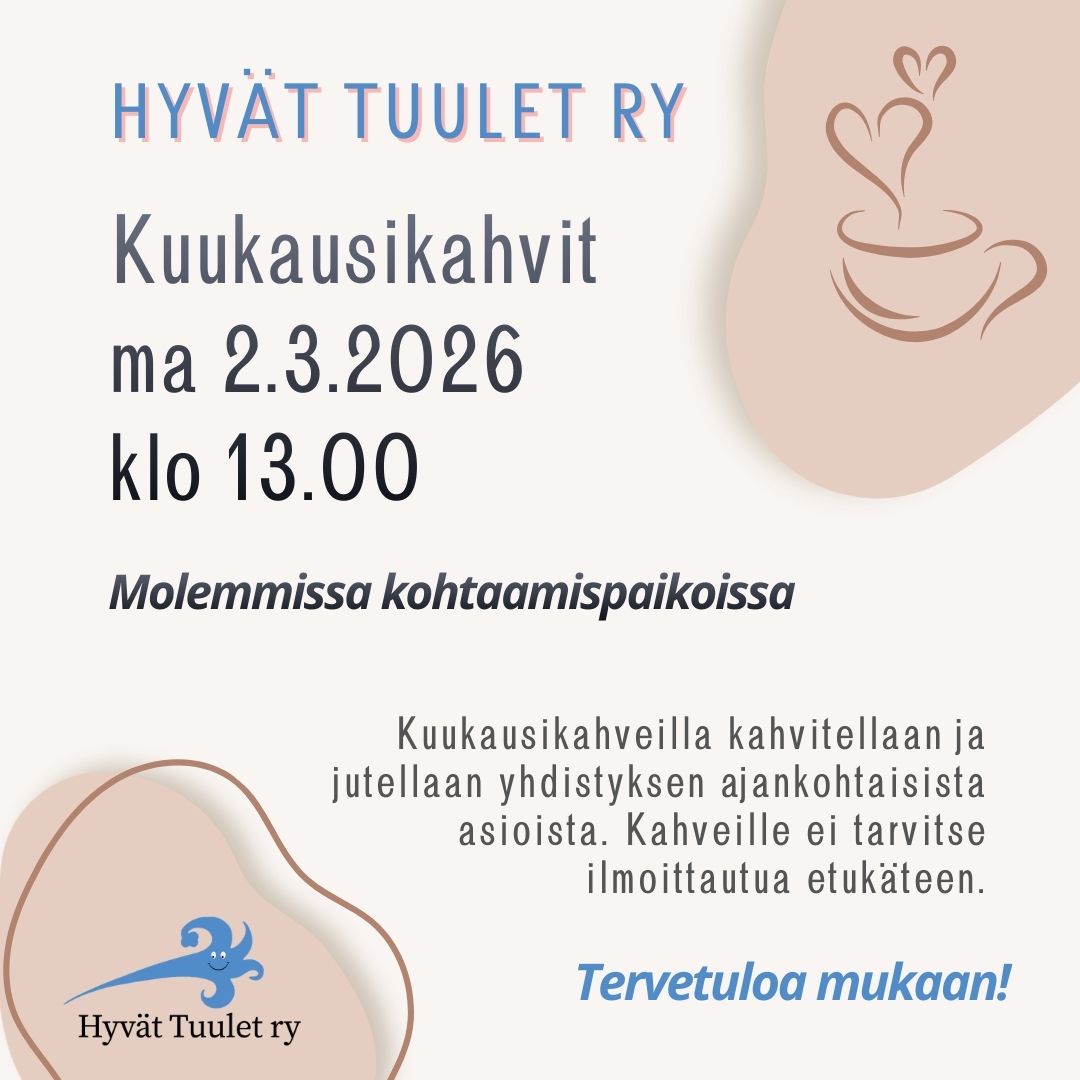 Tervetuloa Kuukausikahveille ma 2.3. klo 13 alkaen (Lauhatuulessa ja Myöhätuulessa).