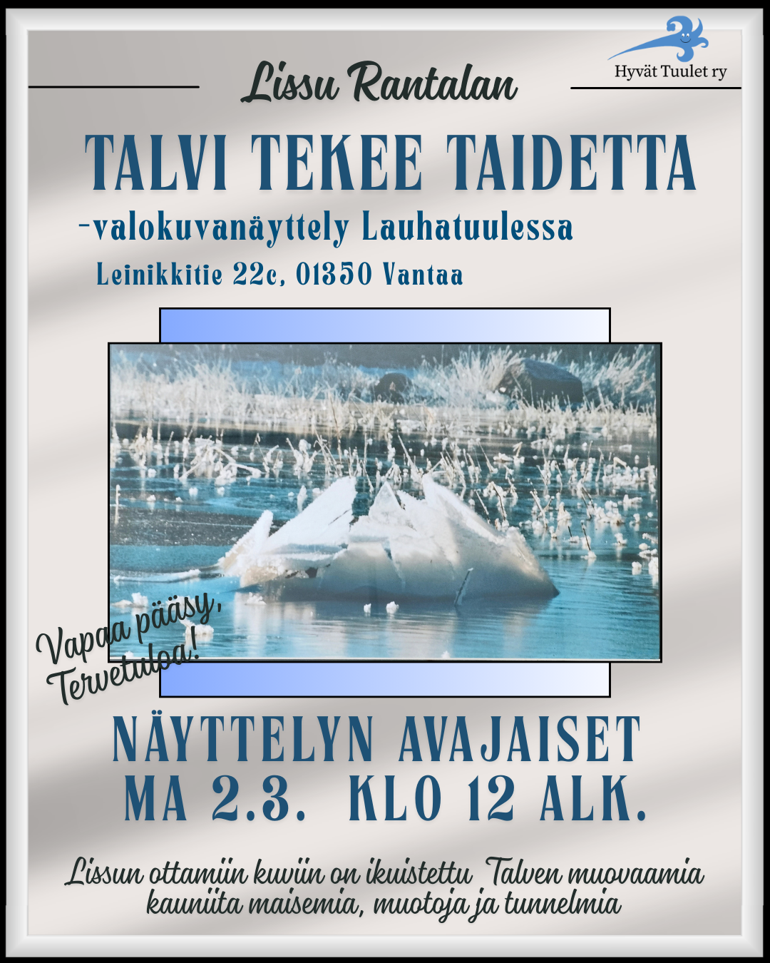 Lissu Rantalan "Talvi tekee taidetta"  -valokuvanäyttelyn avajaisia vietetään Lauhatuulessa Ma 2.3. klo 12 alkaen.