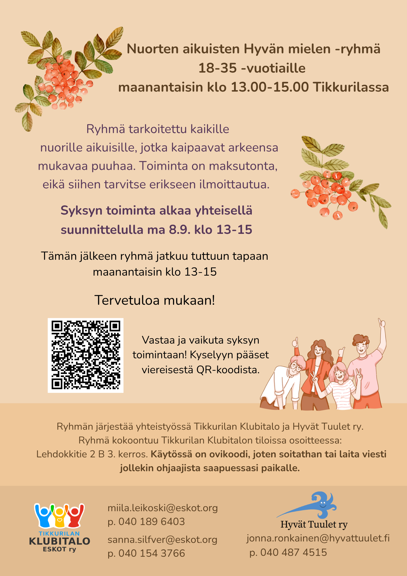 Nuorten aikuisten Hyvän Mielen-ryhmä joka maanantai 8.9. lähtien klo 13-15!