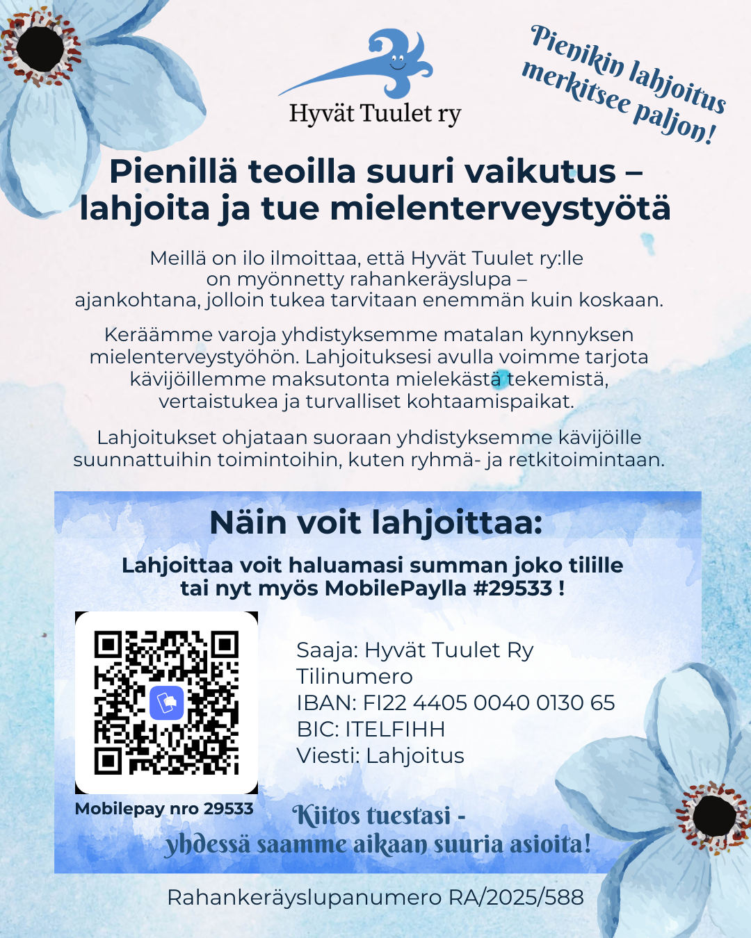 Lahjoittaa voit haluamasi summan joko tilille tai nyt myös MobilePaylla #29533!