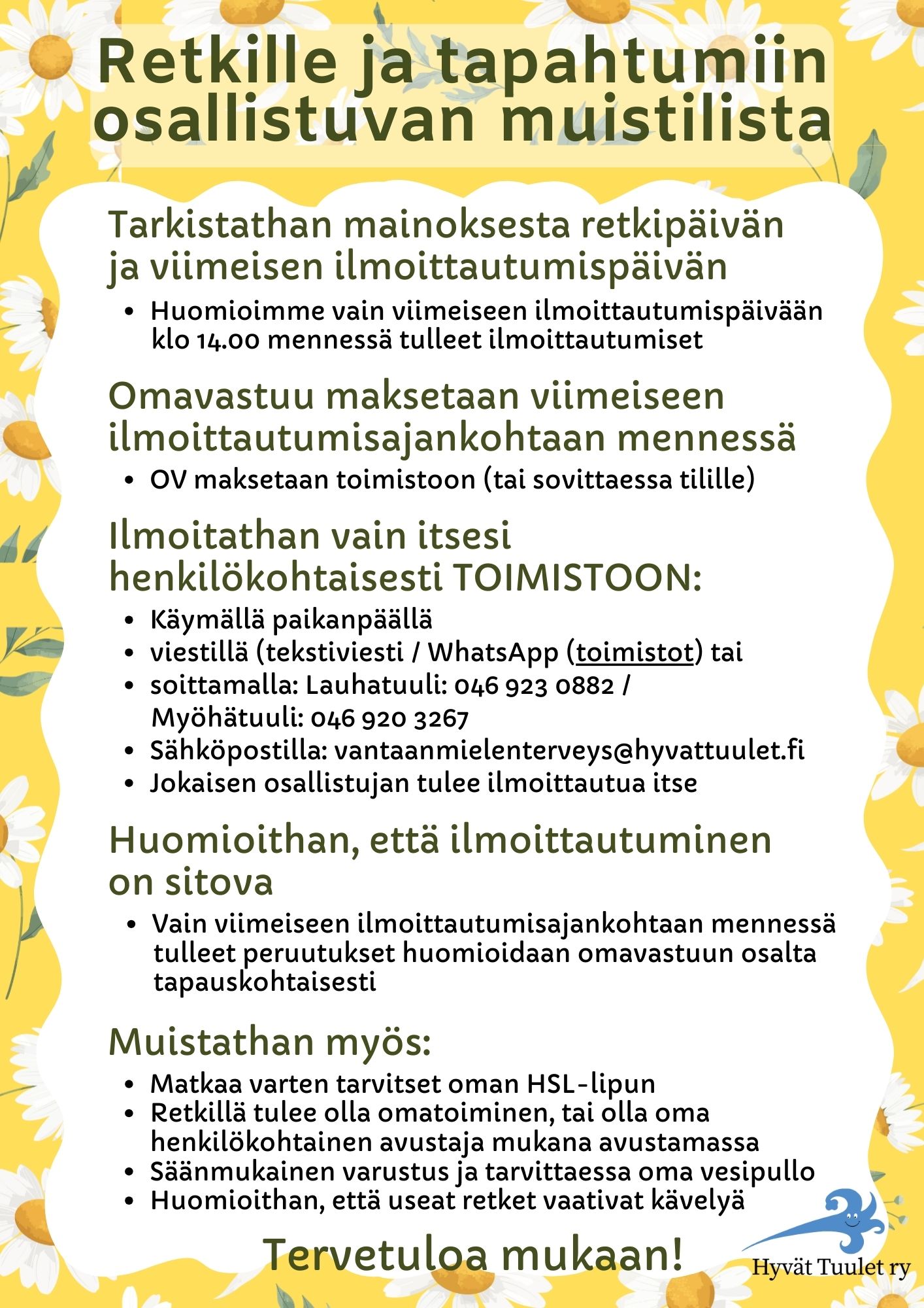 - Jokaisen tulee ilmoittaa itsensä toimistoon joko käymällä paikan päällä, laittamalla tekstiviestiä tai yksityisviestiä WhatsAppissa (Lauhatuuli: 0469230882 Myöhätuuli: 0469203267 tai sähköpostilla vantaanmielenterveys@hyvattuulet.fi . Ryhmiin tai toisten kautta tulleita ilmoittautumisia emme voi huomioida.
