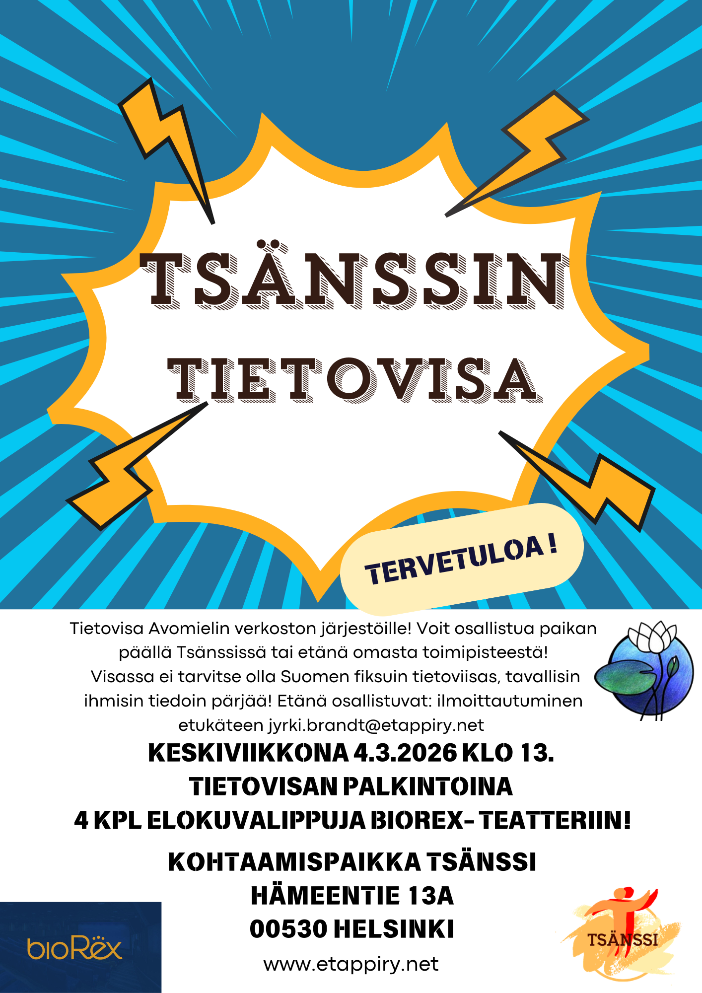 Saataisiinko joukkue/joukkueet Tsänssin tietovisa-turnaukseen kasaan (Etappi ry, Hämeentie 13A, Helsinki)?