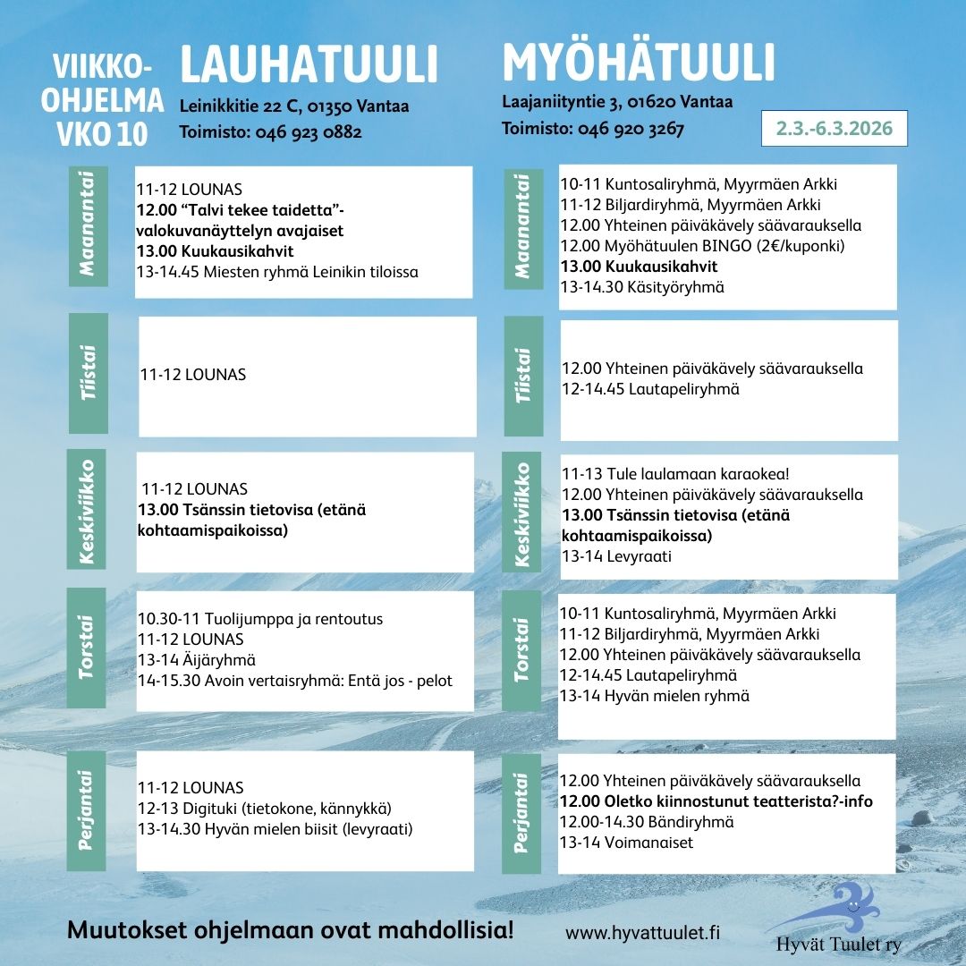 Retkille ilmoittaudutaan toimistoihin henkilökohtaisesti Lauhatuuli 046 923 0882 Myöhätuuli 046 920 3267 vantaanmielenterveys[at]hyvattuulet.fi