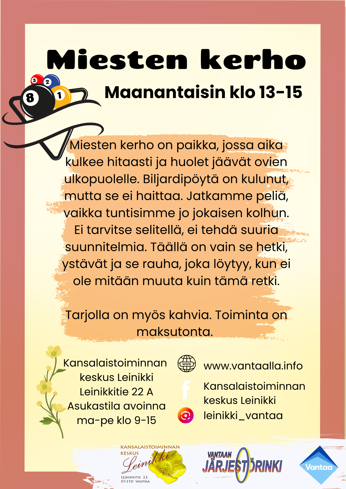 Tervetuloa viettämään rennosti aikaa yhdessä, pelaillen biljardia, kahvitellen ja rupatellen!