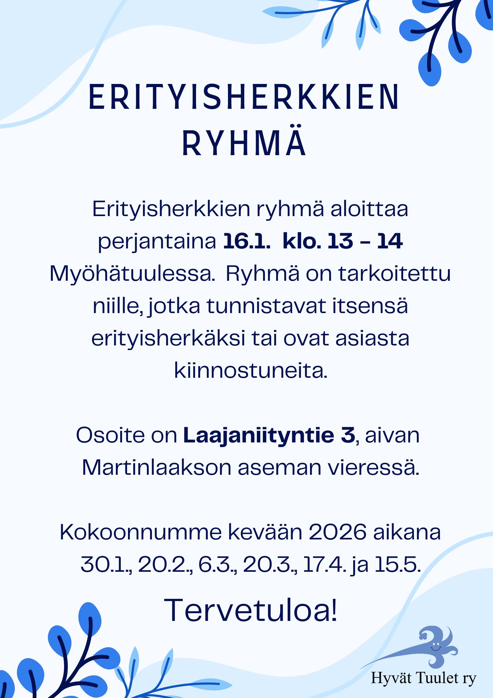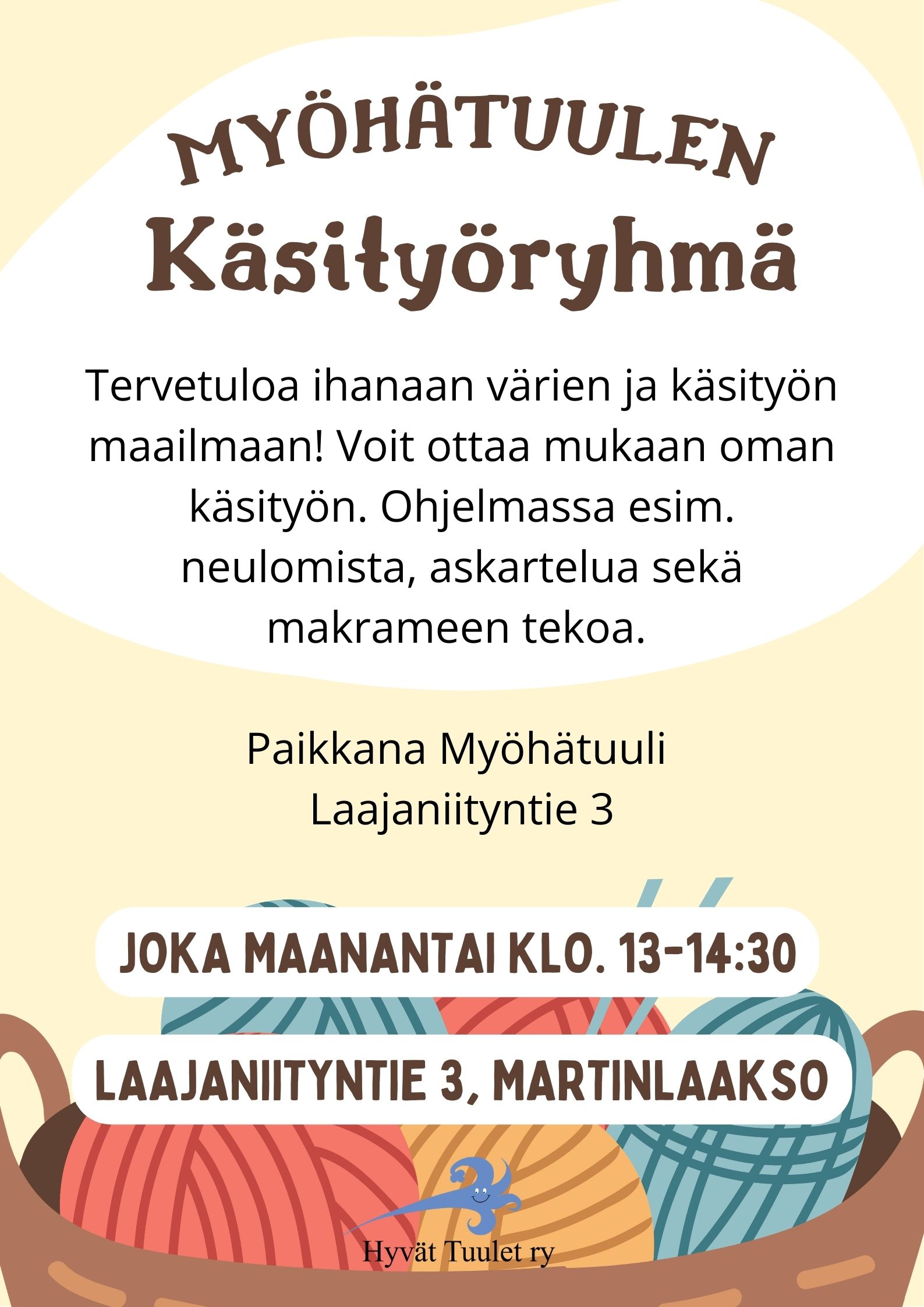 Lisätietoja Myöhätuulen ryhmistä voit kysyä toimistosta. Puhelin 046 920 3267.