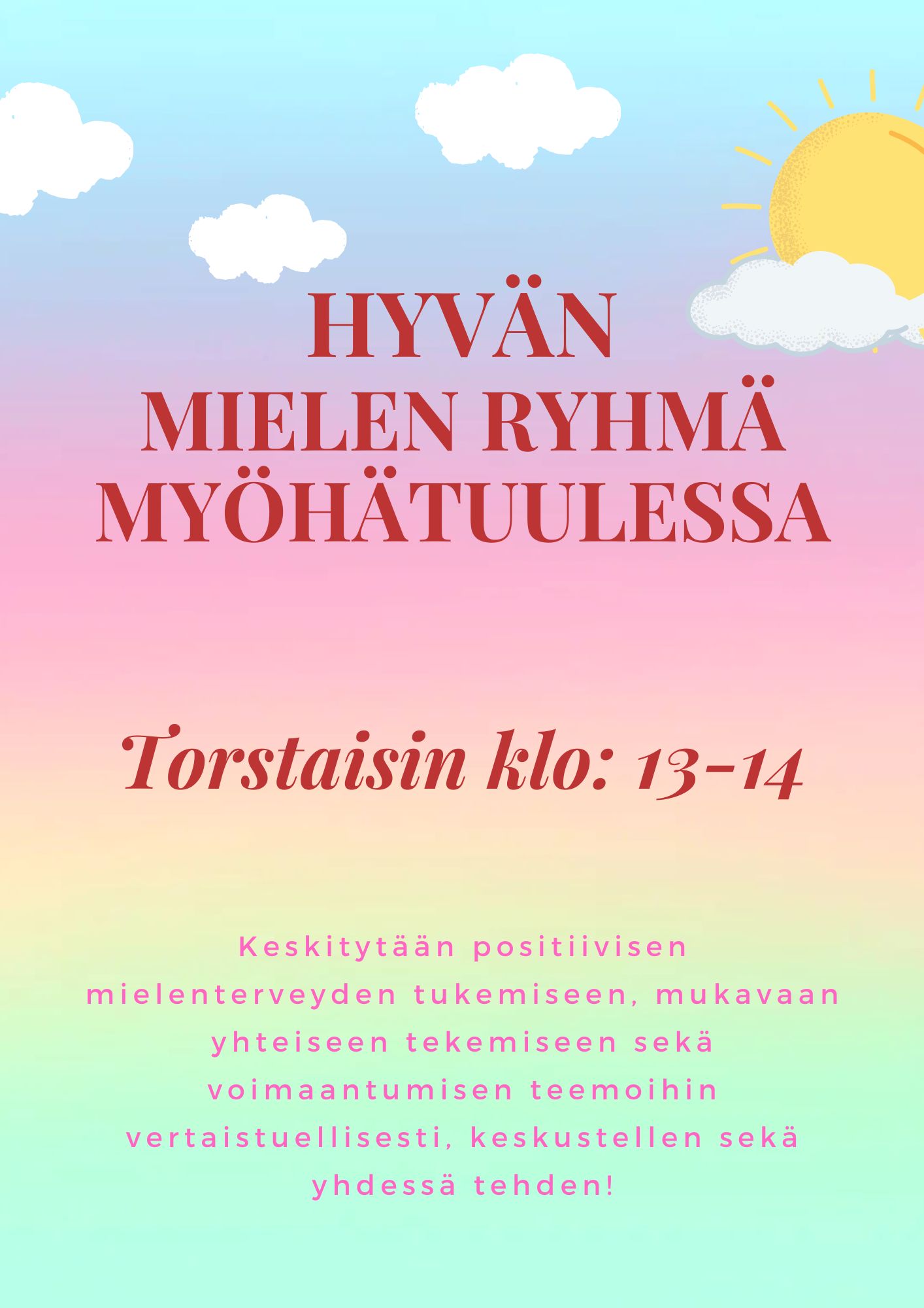 Keskitytään positiivisen mielenterveyden tukemiseen, mukavaan yhteiseen tekemiseen sekä voimaantumisen teemoihin vertaistuellisesti keskustelleen sekä yhdessä tehden!