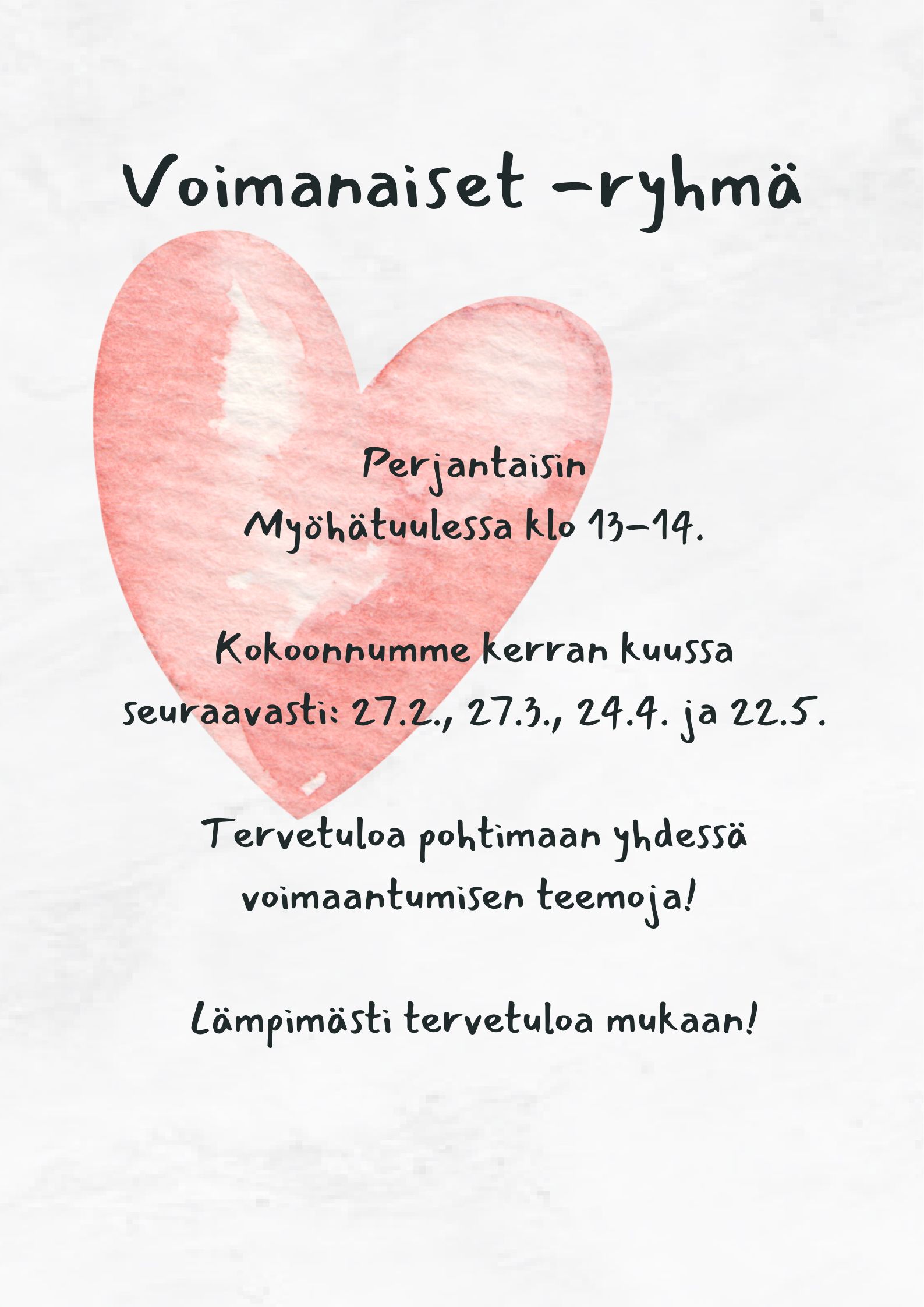 PS. Ryhmä kokoontuu vuorokuukausin kohtaamispaikoissa, seuraava tapaaminen on Lauhatuulessa maaliskuussa (17.3.)!