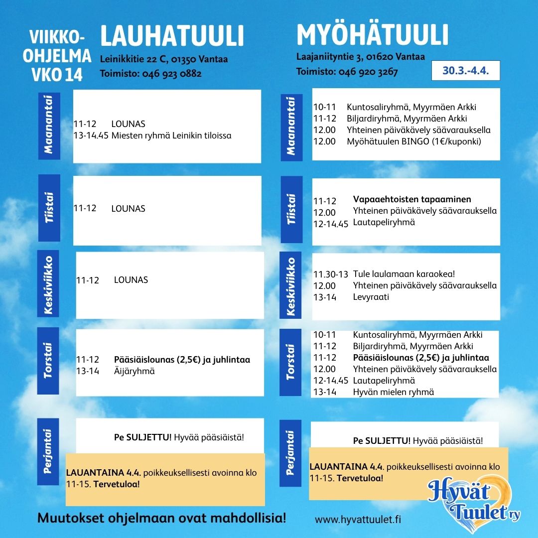 - To 16.4. Vapaaehtoisten tapaaminen Myöhätuulessa klo 11