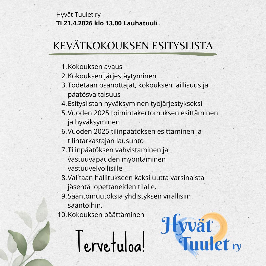 Tiistaina 21.4. klo 13.00 on Hyvät Tuulet ry:n kevätkokous.