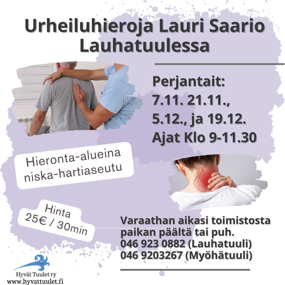 Laurille voit varata hieronta-ajan toimistosta etukäteen.