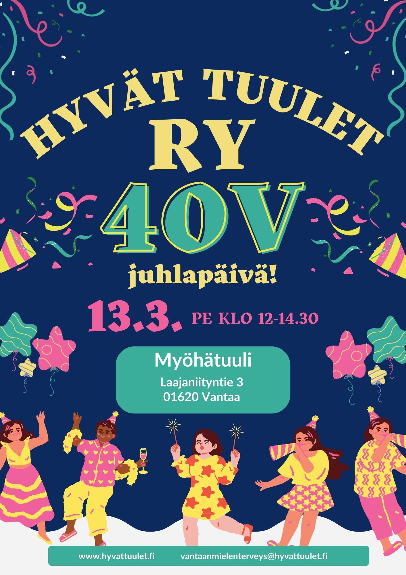 - Ilmoittautuminen ma 2.3. mennessä: Hyvien Tuulien 40-v juhlat pe 13.3. (Myöhätuuli),