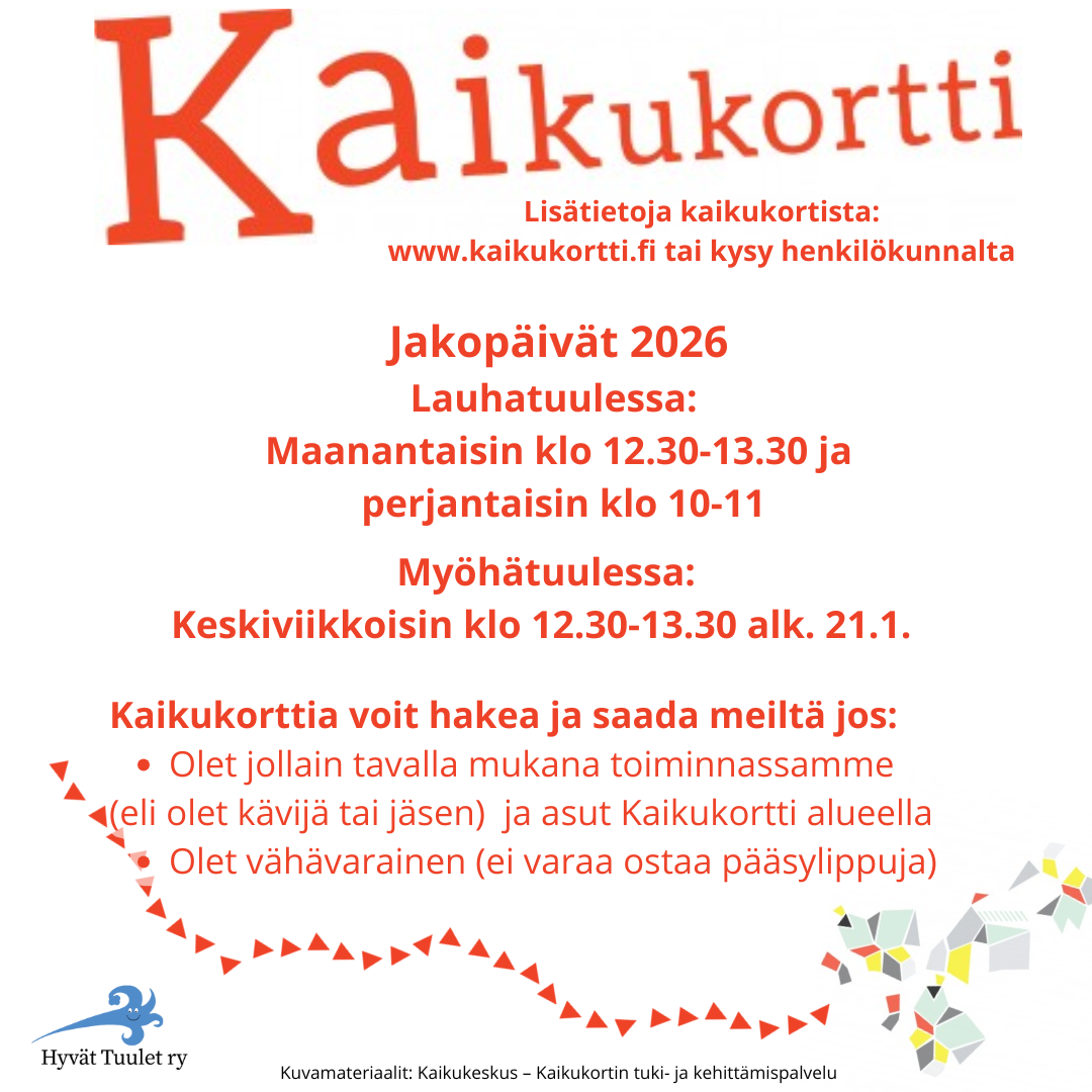 Kaikukortin voit saada meiltä, mikäli ehdot täyttyvät. Ehtojen mukaan sinun pitää olla jollain tavalla mukana toiminnassamme ja taloudellinen tilanteesi estää sinua ostamasta pääsylippuja.