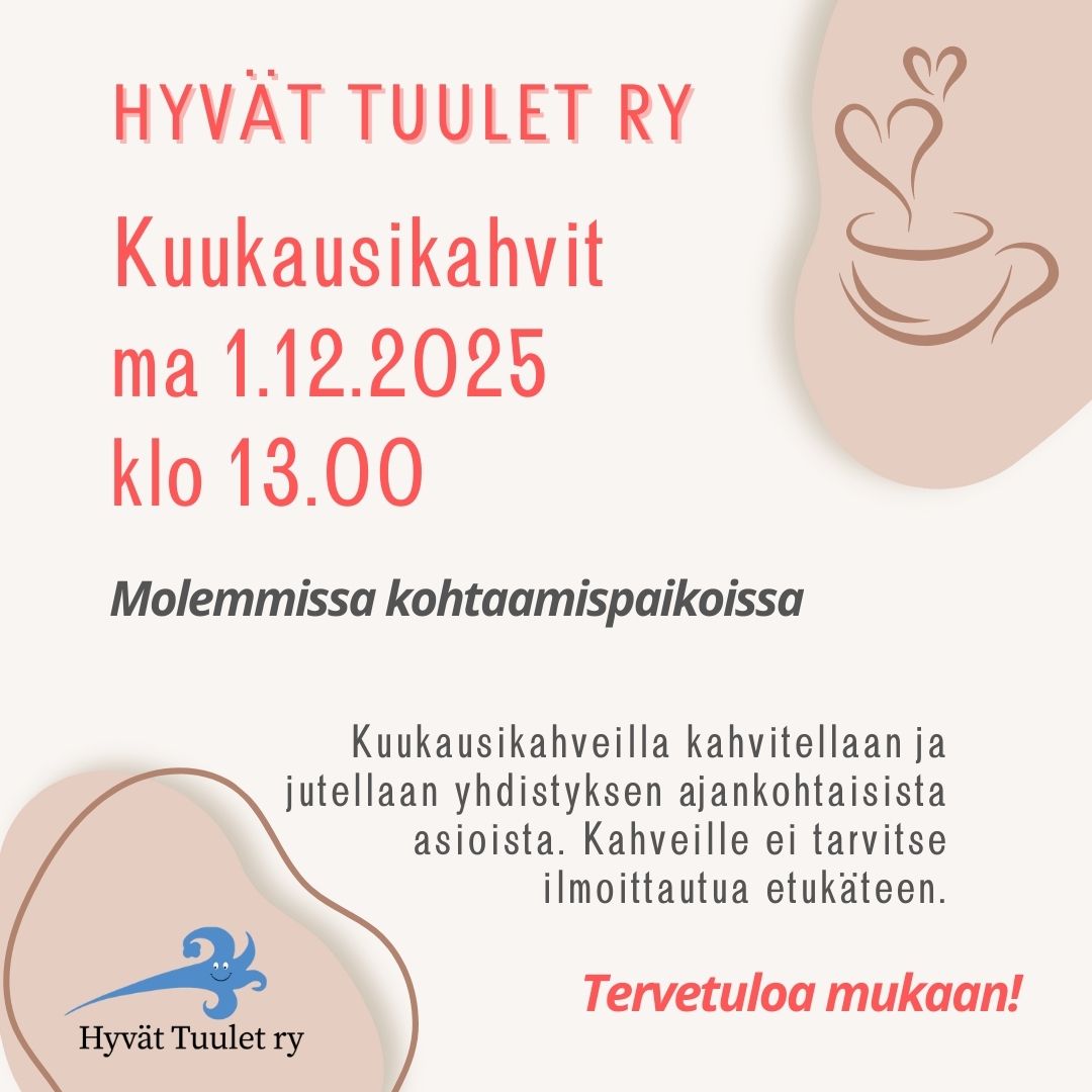 Tervetuloa kuukausikahveille (molemmissa toimipisteissä) maanantaina 1.12. klo 13 alkaen, keskustelemaan yhdisyksen ajankohtaisista asioista!