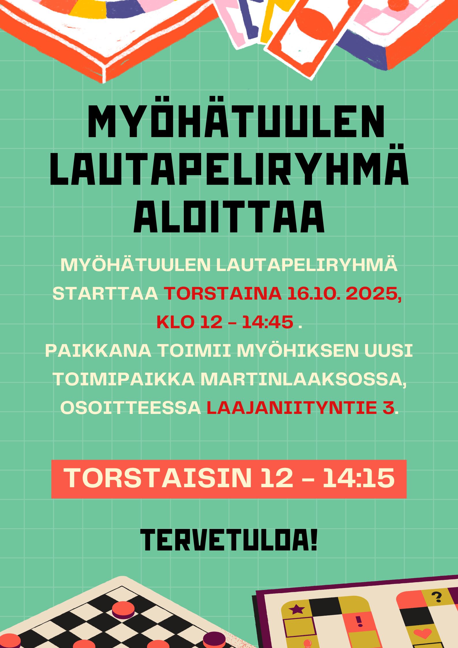 Myöhätuulen lautapeliryhmä aloittaa toimintansa torstaina 16.10 klo. 12.00. Paikkana Myöhiksen uudet tilat Martinlaaksossa, osoitteessa Laajaniityntie 3.