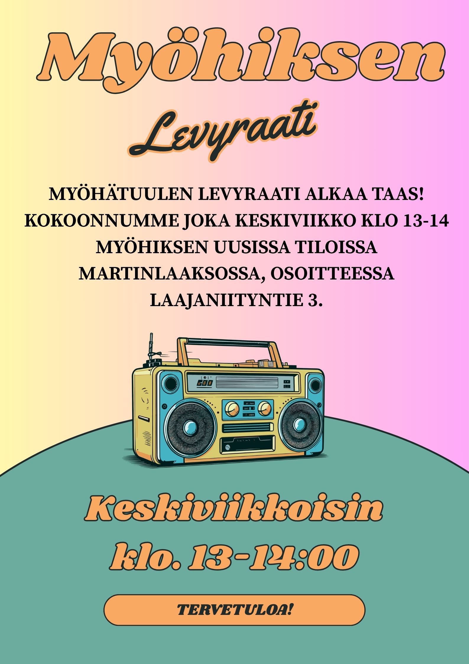 Myöhätuulen levyraati alkaa taas pyöriä! Kokoonnumme keskiviikkoisin klo. 13-14:00 Myöhiksen uusissa tiloissa Martinlaaksossa. Osoite on Laajaniityntie 3