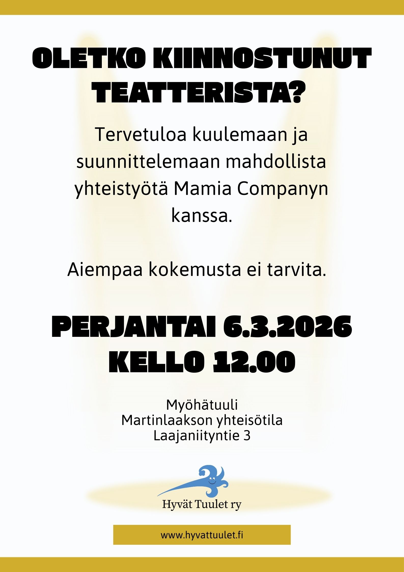 Tervetuloa kuulemaan ja suunnittelemaan mahdollista yhteistyötä Mamia Companyn kanssa. Aiempaa kokemusta ei tarvita. Perjantaina 6.3.2026 klo 12 Myöhätuulessa. Tervetuloa!