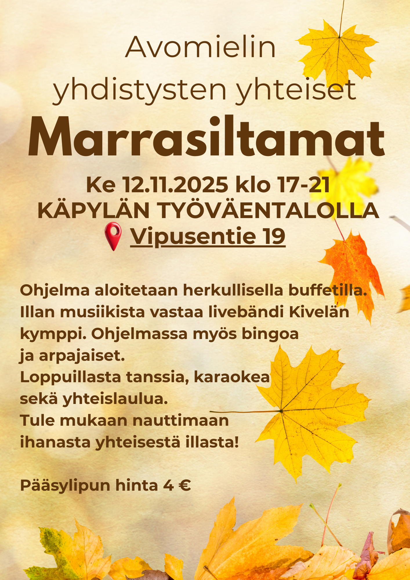 Tilaisuus pidetään keskiviikkona 12.11.2025, HUOM! klo 16:30-20:00 (kuvassa väärä kellonaika), Käpylän työväentalolla. Osoite on Vipusentie 19, Helsinki. Ohjelmassa mm. livebändi Kivelän kymppi, bingo sekä arpajaiset.