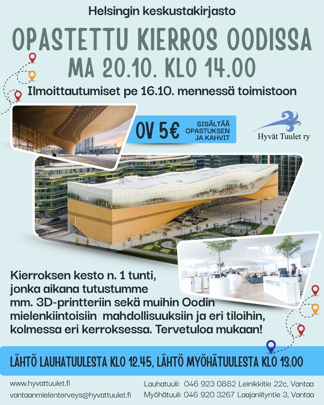 Yhteislähtö Lauhatuulesta klo 12.45 ja Myöhätuulesta klo 13 julkista liikennettä käyttäen. Kierroksella tutustutaan tarkemmin Oodin moniin palveluihin sekä tiloihin, joita onkin kolmessa kerroksessa eli nähtävää riittää.