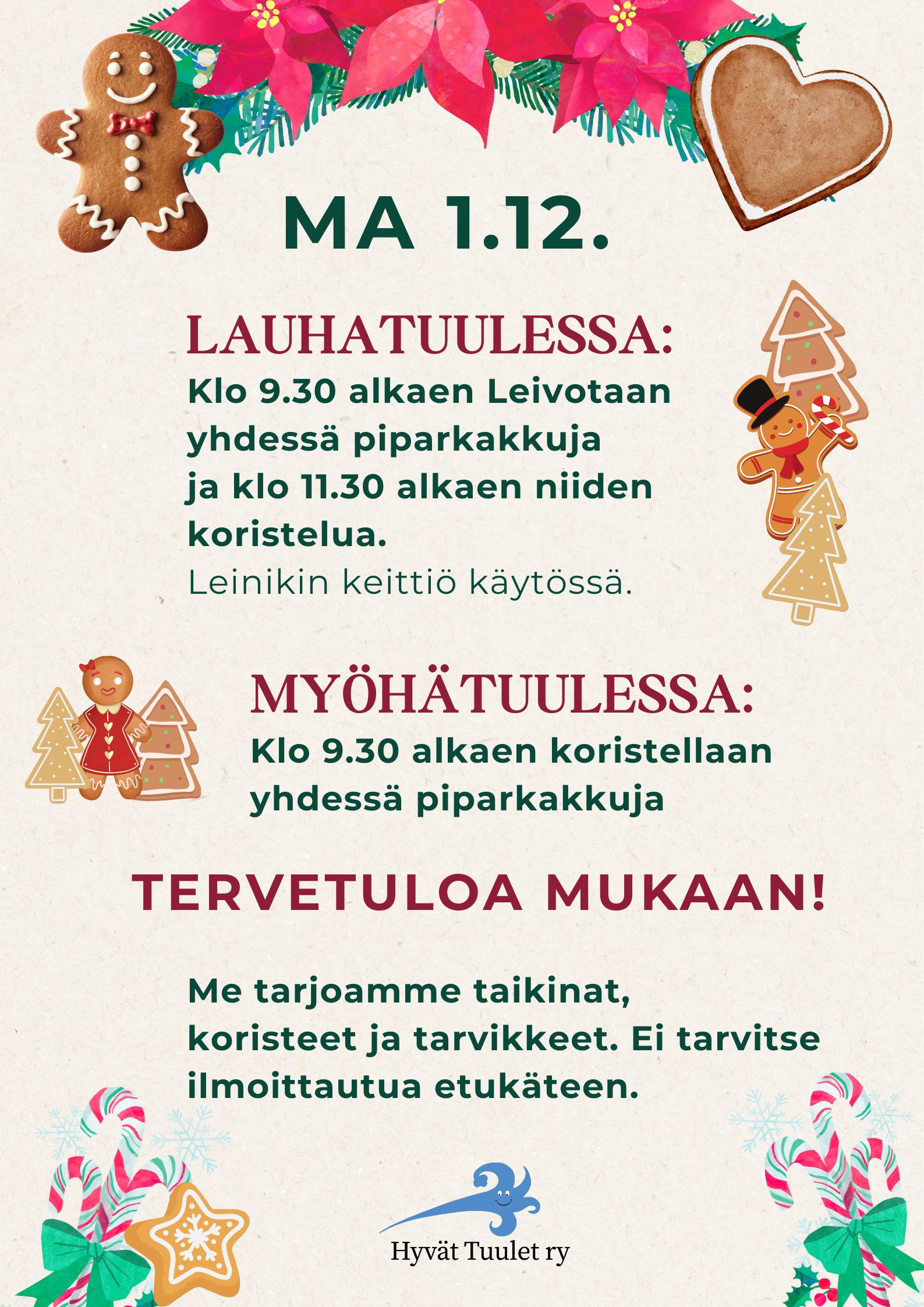 LAUHATUULESSA leivotaan pipareita klo 9.30 alkaen ja koristellaan niitä klo 11.30 alkaen. Käytössämme on Järjestöringin (Leinikin) keittiö.