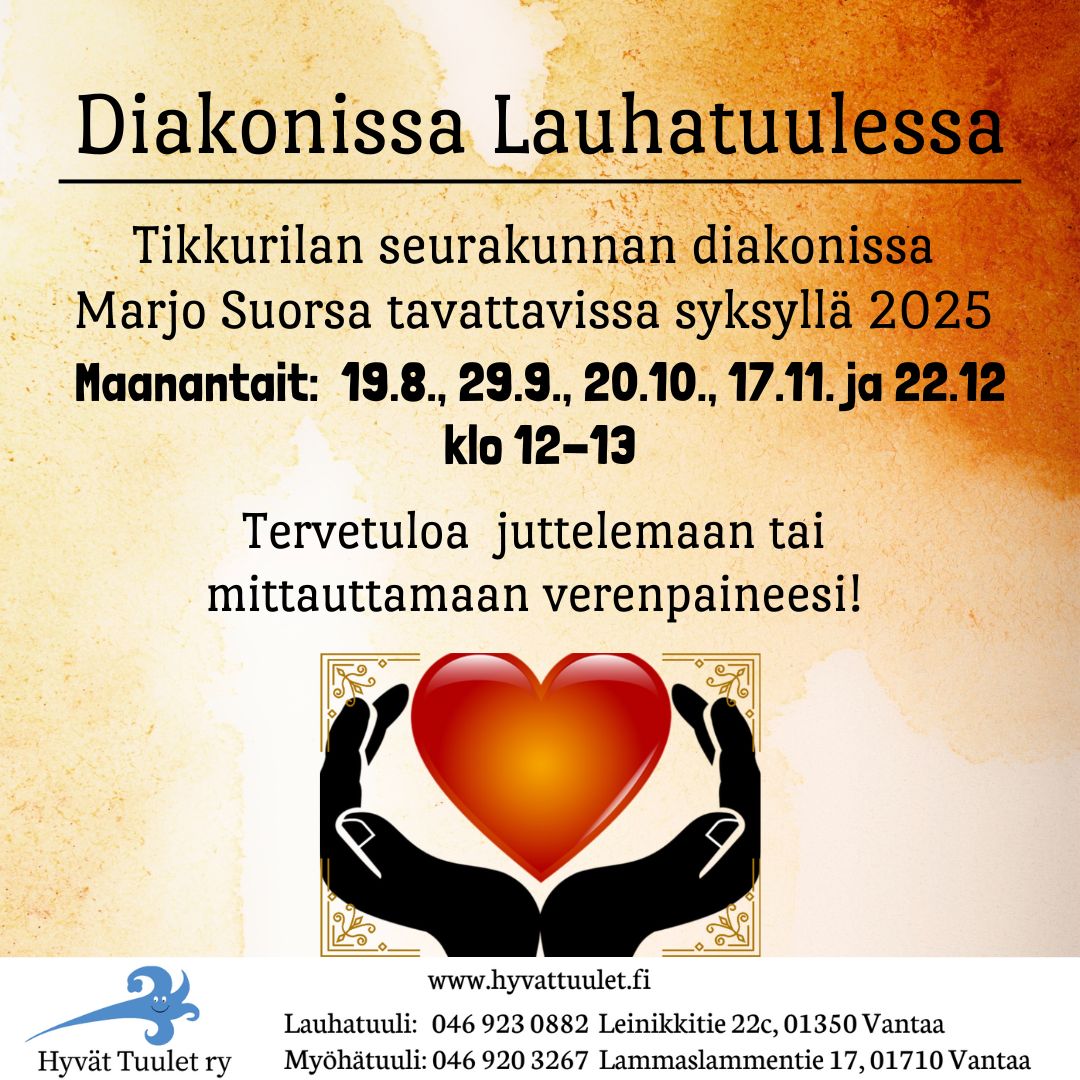 Tikkurilan seurakunnan Diakonissa Marjo Suorsa tavattavissa Lauhatuulessa kerran kuussa maanantaina.