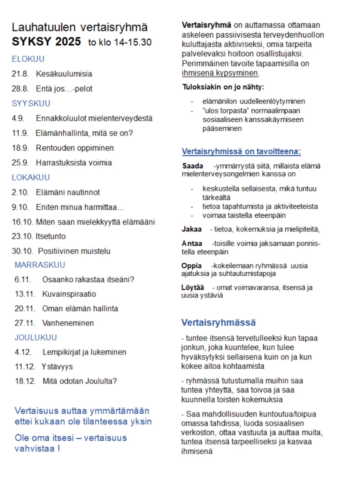 Katso vertaisryhmän kokoontumisten tarkemmat aiheet oheisesta kuvasta.
