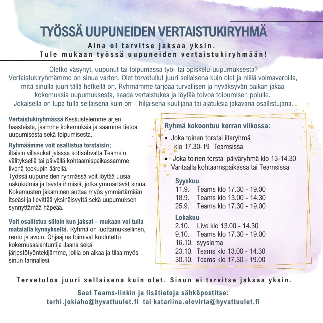 13 - 14.30     Työssä uupuneiden vertaistukiryhmä Teamsissa tai kohtaamispaikoissa