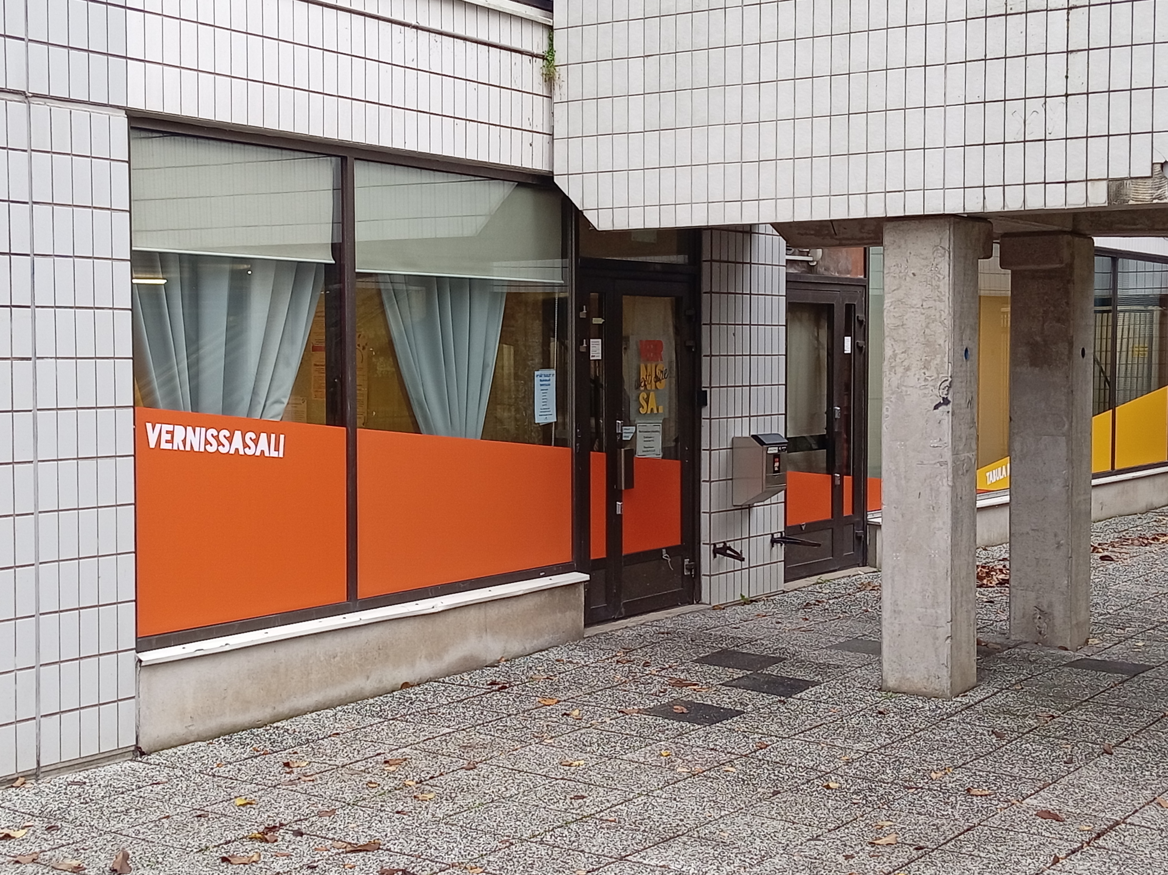 Sijaitsemme katutasossa, ikkunoissa lukee vielä toistaiseksi Vernissasali.