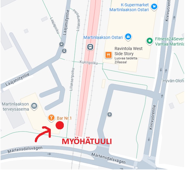 Myöhätuuli sijaitsee Martinlaakson juna-aseman lähellä, radan länsipuolella. Osoite on Laajaniityntie 3. Sijaitsemme katutasossa, ikkunoissa lukee vielä toistaiseksi Vernissasali. Ovikello ei vielä toimi, joten koputa rohkeasti oveen.