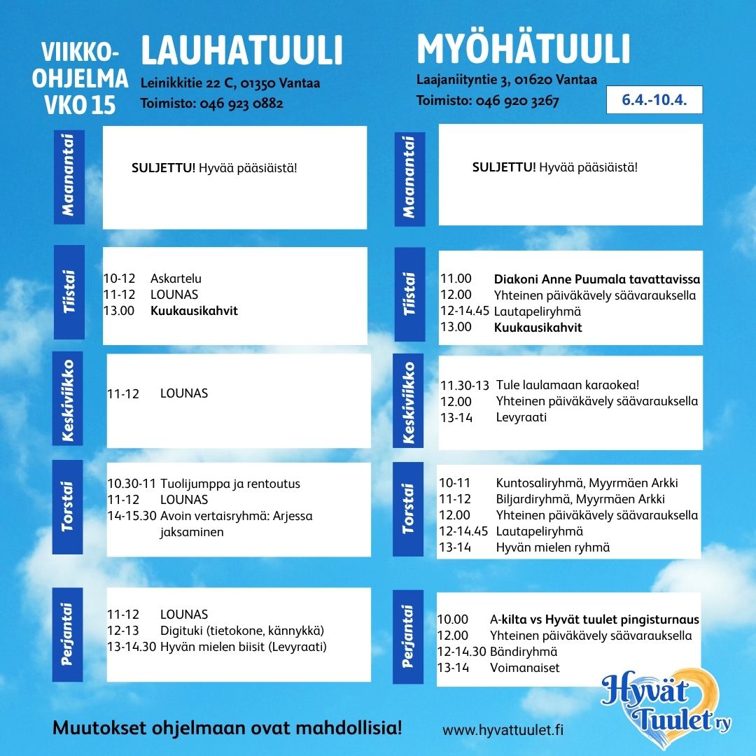 - Ma 20.4. Vapaaehtoisten tapaaminen Lauhatuulessa klo 12
